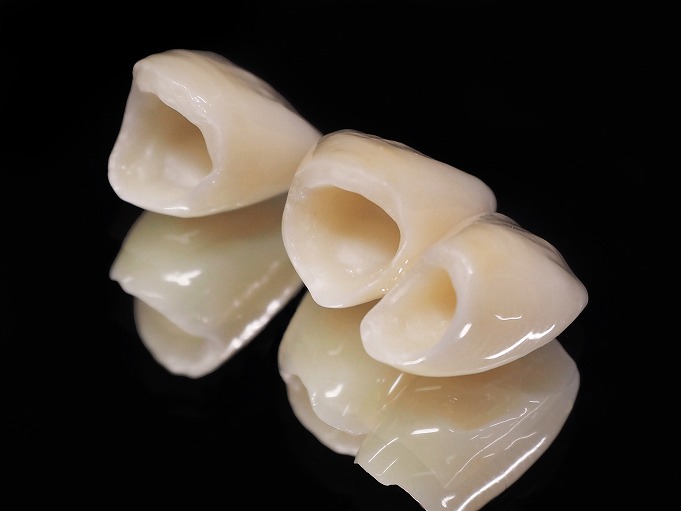 - 内側の金属が透けて見えることを防ぐため、オールセラミックと比べると、外側のセラミックの透明感をやや落とす必要があります。